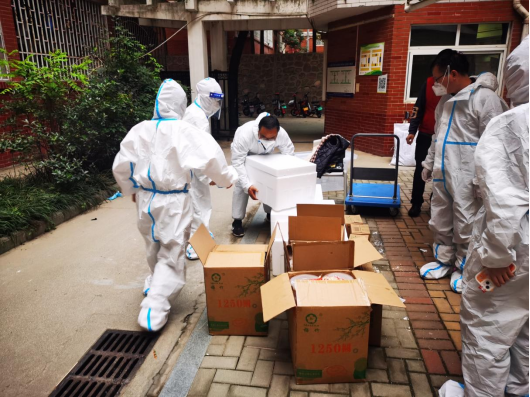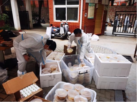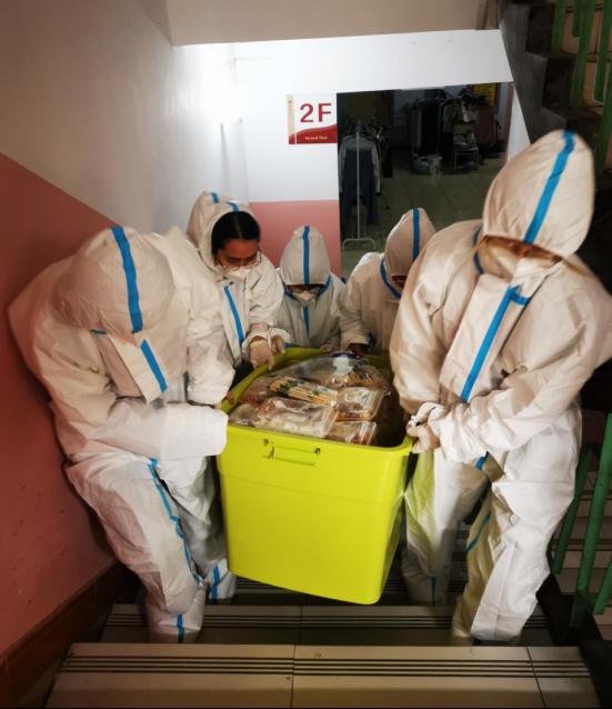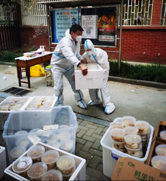 beat365共有15名教职工志愿者驻校工作,承担北苑2号楼和6号楼共计1974名员工的网格化管理任务,每天为员工送餐、组织并协助核酸检测以及生活物资、药品配送等工作。送餐看似简单的工作,却需用心才能做好,对接楼层长和餐厅负责人统计好每一餐数量,争取以最快的速度把热乎乎的饭菜送到员工手中。