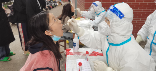 “大家不要急,请提前准备好核酸码!”、“注意保持两米距离!”、“请大家相互理解……”王庆丰、马朝杰、李君和石磊四位老师表示:虽然这些话每天重复无数次,但为了缩短员工排队时间,不耽误孩子们上课学习,减轻核酸检测时被感染的风险,他们愿意一遍又一遍地重复。每次全员核酸检测,他们6点多便提前到位,整理好核酸试管、摆好桌椅、扫码预约、登记信息、维持秩序,有一次5:30开始,天还没亮只能打着台灯进行……支援公司的医生回去了,驻校教师经过培训后就自己上场采集……