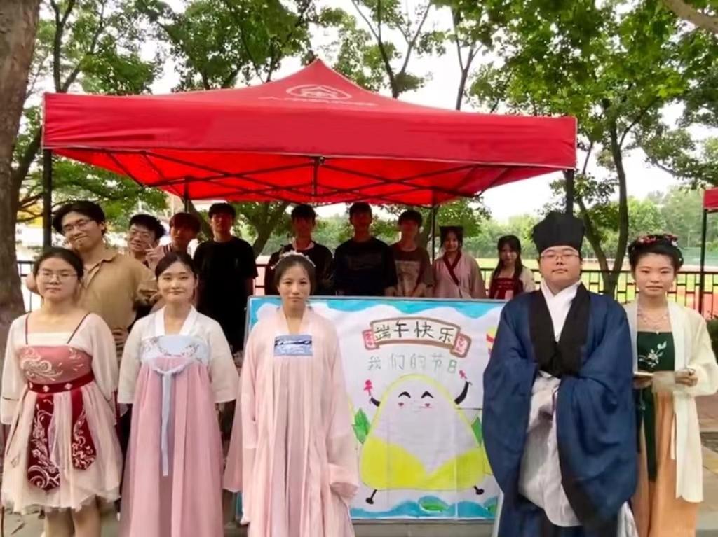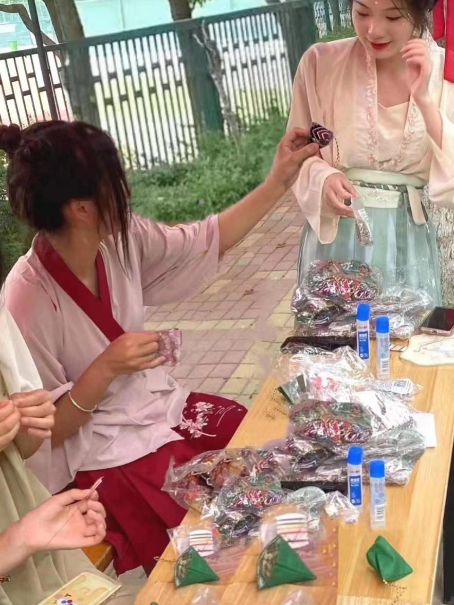 在活动现场,工作人员现场教学折纸龙舟、手工制作粽子香囊,同学们进行端午节知识有奖问答,内容丰富多彩。到场参与的同学们热情洋溢、其乐融融,一起穿针引线,一起探讨交流。一个个小巧玲珑的粽子香囊不断被大家缝制出来,装上挂绳显得尤为沁人心脾,香囊虽小,承载着端午民俗美好的愿望,为这个端午节增添了不一样的色彩!汉服社的员工们身穿汉服,尽显魅力,受到了同学们的瞩目并纷纷合影留念。