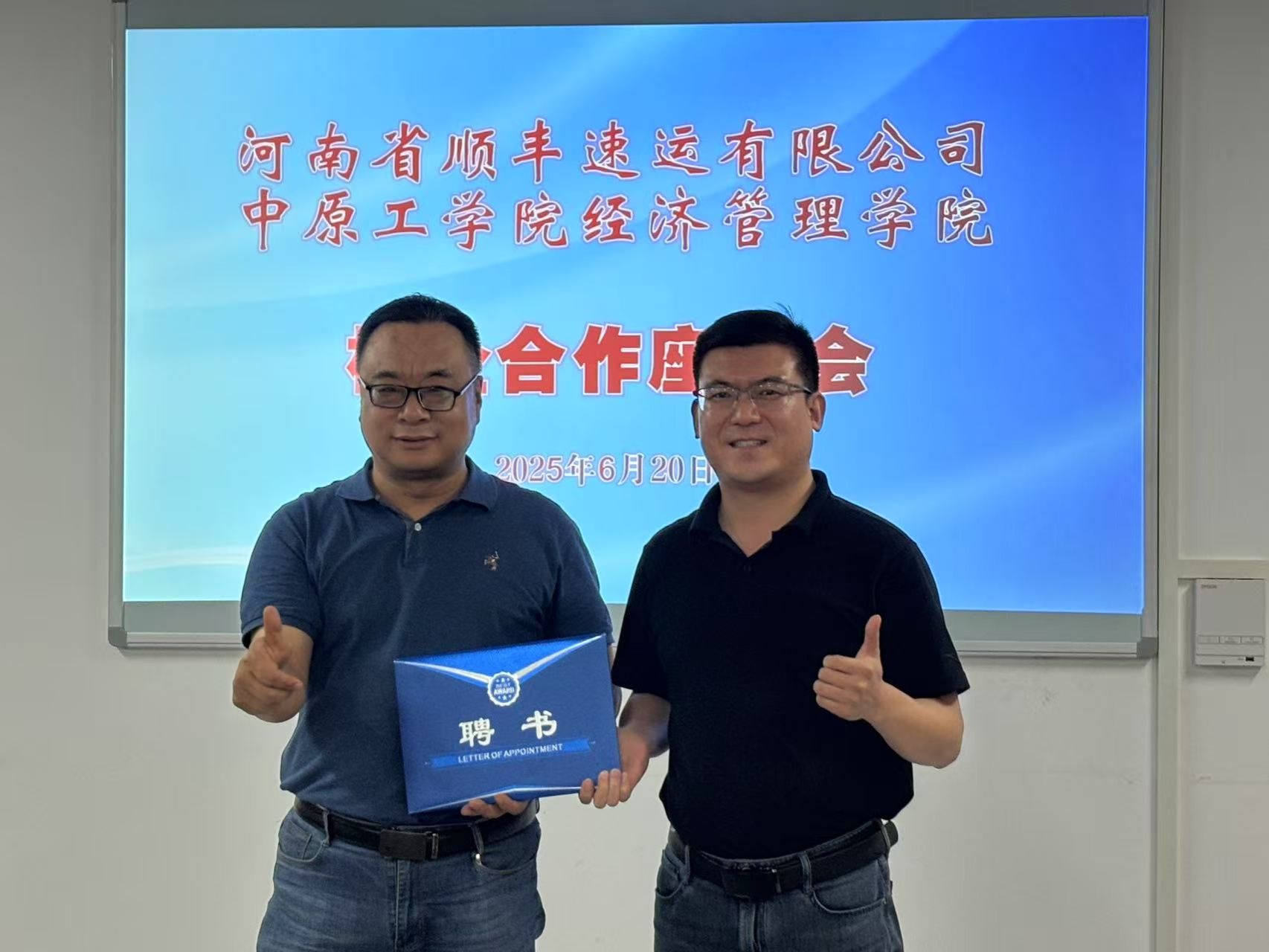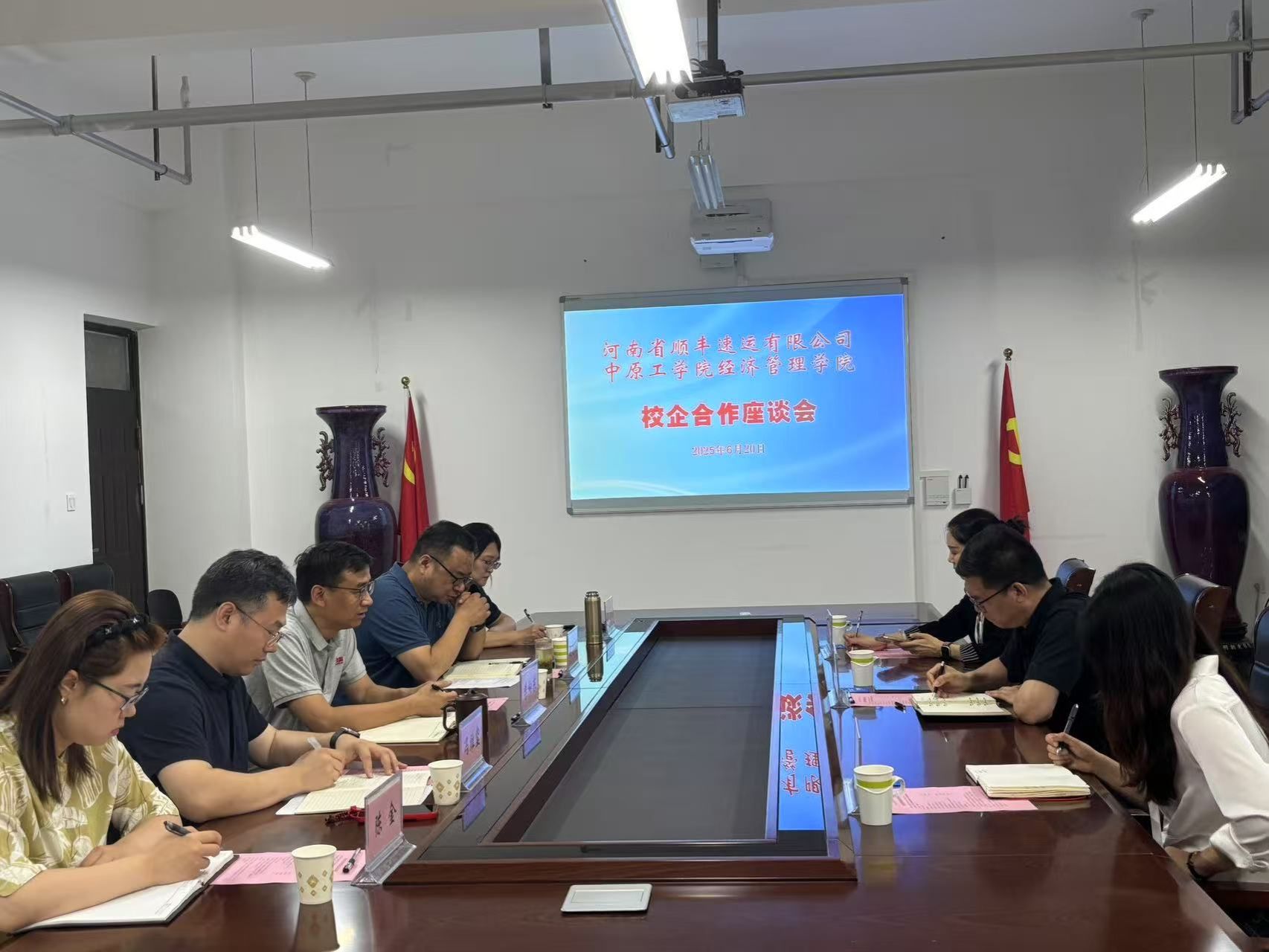 6月20日,公司与河南顺丰在beat365龙湖校区3号组团楼A306会议室就深化校企合作举行座谈会。顺丰集团河南区人力资源副总监杨楠,校招负责人杨静,老员工培训负责人李永佳;公司党委书记李向东,经理赵志泉,物流工程系主任李紫瑶,副主任兼党支部书记冯维玺,学工办副主任陈金出席会议。