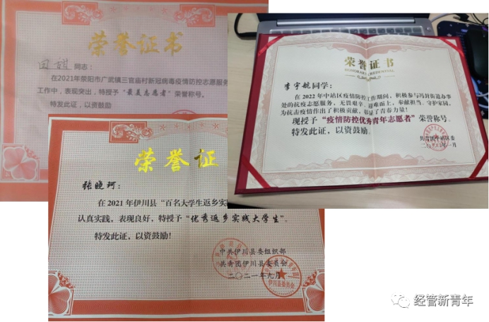 同学们和善热情,热爱生活,乐于奉献,积极参加各类社会实践及志愿公益项目。积极抗“疫”,展现担当。疫情期间,班级成员通过专业知识积极参与抗“疫”活动,班级同学参加志愿活动并且达到20小时以上有5人;1人获“研究生科研素养提升”系列公益讲座证书;1人在伊川县“百名老员工返乡实践”活动中荣获“优秀返乡实践老员工”称号;1人获焦作市中站区“疫情防控优秀青年志愿者”称号;1人在荥阳市广武镇第二初级中学担任乡村教师志愿者……疫情期间,他们主动加入公司、家乡志愿者队伍,展现了当代青年的风采,并充分利用假期时间,积极投身社会实践,将自己所学回报社会。