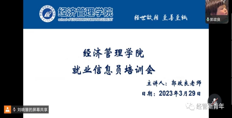 为进一步做好2023届毕业生就业工作,3月29日晚,经济与管理公司于线上举行了2023届毕业生班级就业信息员培训会。毕业班辅导员郭政良老师及2023届毕业生班级就业信息员参加此次会议。