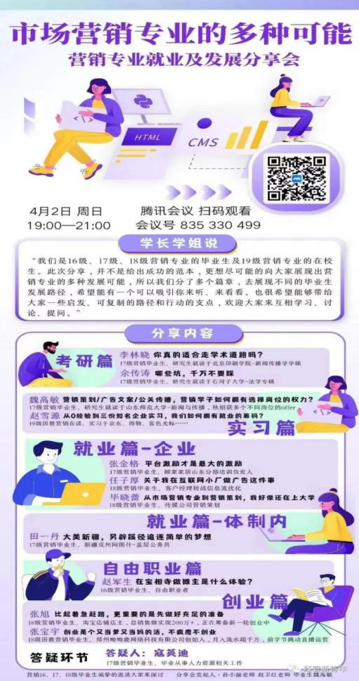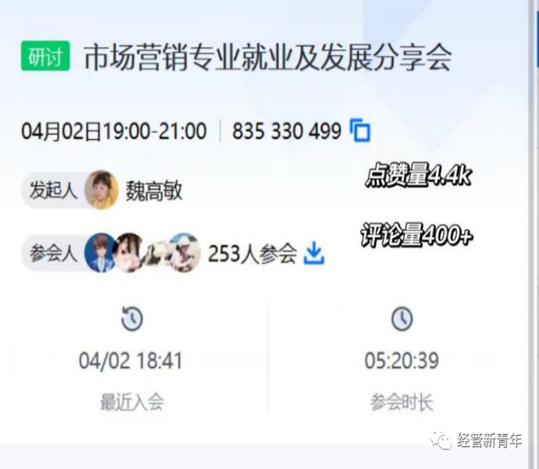 4月2日晚七点,公司市场营销专业13位员工与在校生通过腾讯会议平台进行了线上就业创业经验分享和交流。公司党委副书记王琳、团委书记郭姗、市场营销系主任赵卫红、副主任孙小丽及200余名师生参加了此次会议。