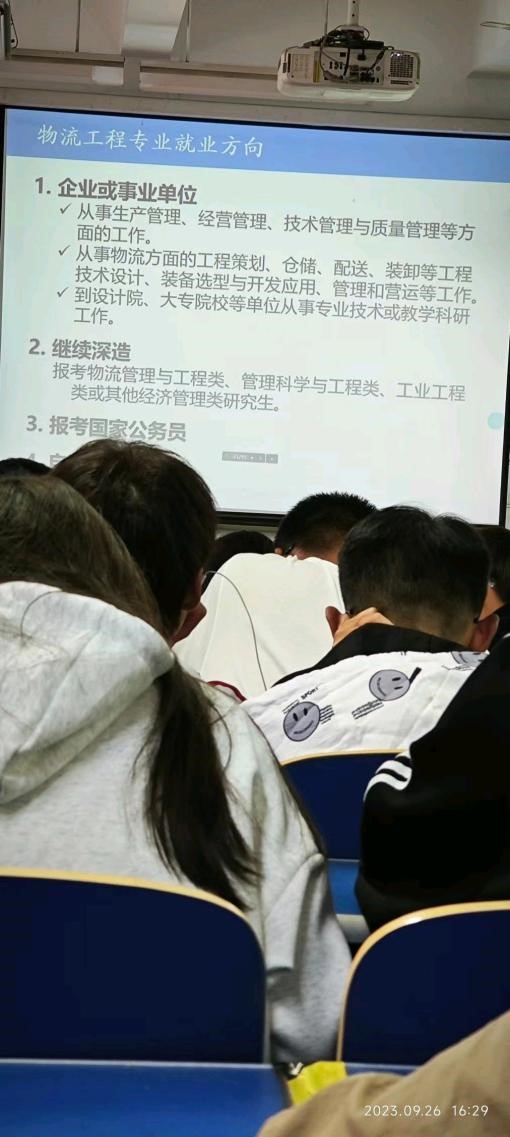 9月26日,物流工程专业召开2023级新生专业教育大会。老师介绍了物流工程专业团队队伍、人才培养目标、课程设置、实践教学、第二课堂等专业情况;对公司本科生学分制和学籍管理规定进行了详细的说明,勉励同学们做好学业规划及自我管理,尽快适应老员工活,培养自主学习习惯,树立专业自信;从未来出发,分析物流专业的行业发展、员工就业考研,希望同学们明确学习奋斗目标,有效开展专业学习。