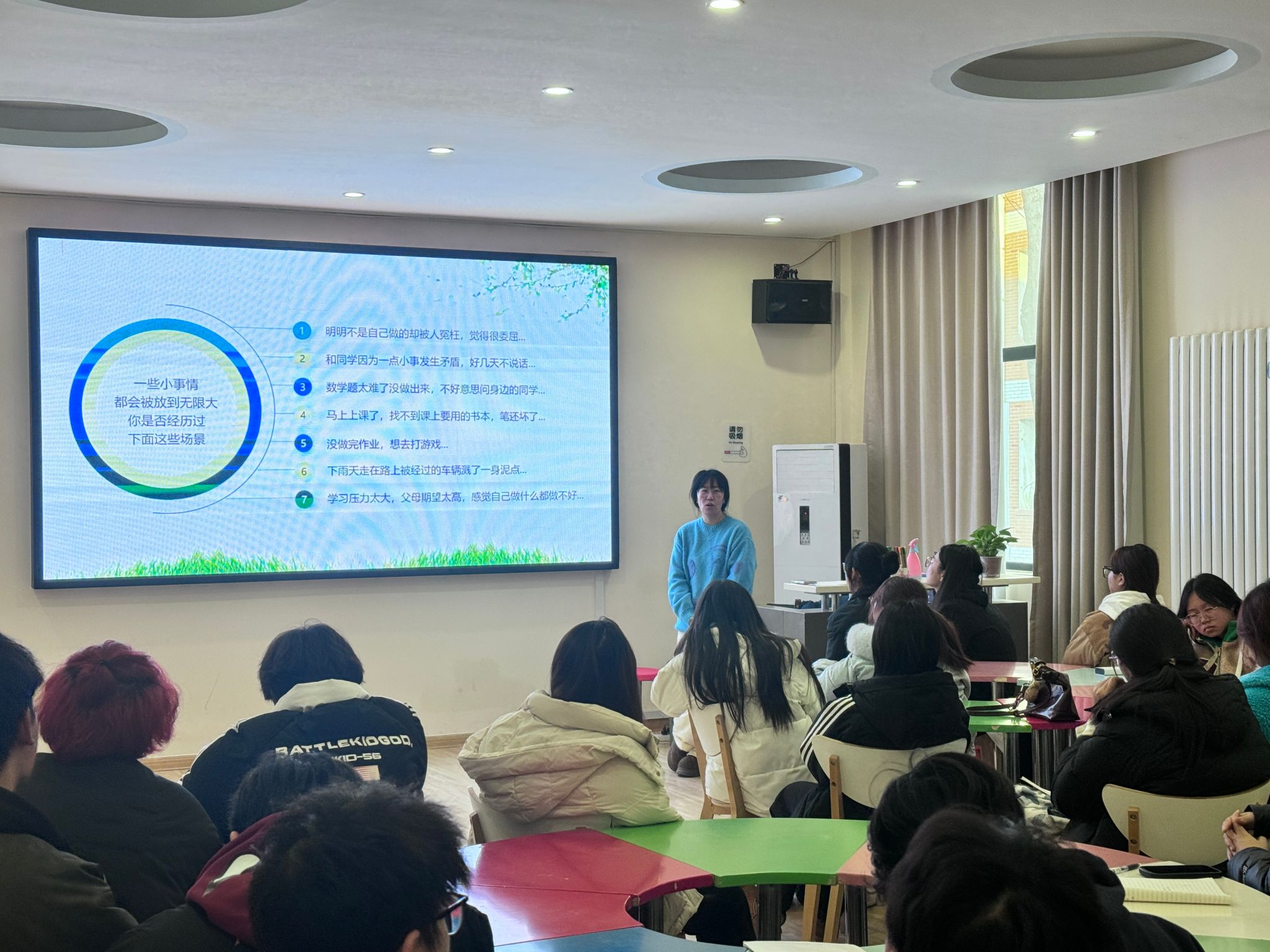 主题教育环节,公司5位辅导员分别对五个板块的内容进行讲述。通过历年员工违规案例给员工敲响警钟、消防视频普及安全知识、分类讲解诈骗手段提升防骗意识、分享学风建设措施和机制使学风建设落得实处、普及心理健康知识使员工了解求助方式和途径。员工干部们都专注聆听,收获满满。