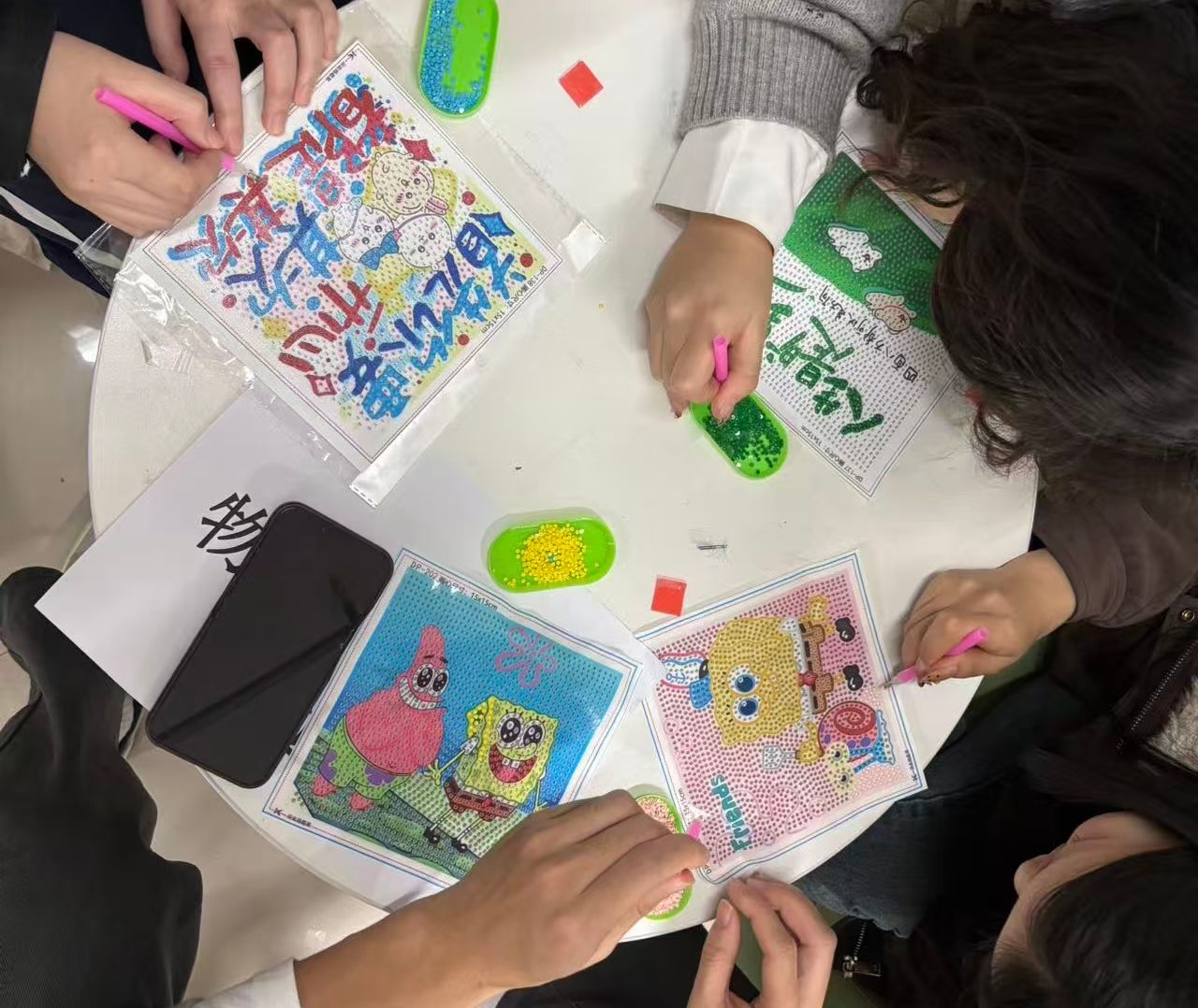 在领取彩钻、胶枪、底胚等配套物料后,大家严格遵循创作流程,或专注投入构思布局,或相互探讨创作技巧,或协同完善细节呈现。现场秩序井然,同学们全神贯注于手中的创作,以严谨细致的态度完成每一个步骤。随着零散物料在指尖逐步整合,一幅幅完整精美的作品相继成型,大家脸上洋溢着满满的成就感与获得感。